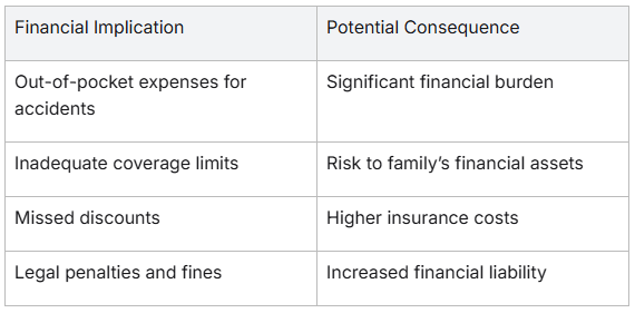 Additionally, uninsured teen drivers risk facing legal penalties or fines if found driving unsupervised without the mandatory coverage. The table below highlights potential financial implications: